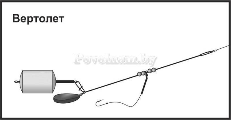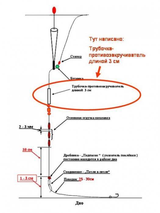 Схема сборки: к палочке толстолоба привязывается леска длиной от 20 до 40 см, на второй конец крепится вертлюжок, за ним идет основная леска для ловли толстолоба с заранее одетым стопорком, скользящим грузом, бусинкой стопорной, поплавком и демпфером.