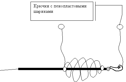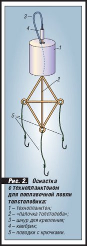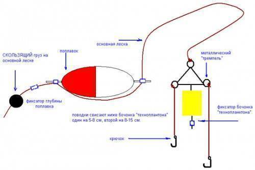 К этому же коромыслу привязывается несколько поводков с крючками. После попадания в воду, технопланктон начинает растворяться, и распадается на мельчайшие частички, которые очень похожи на планктон.