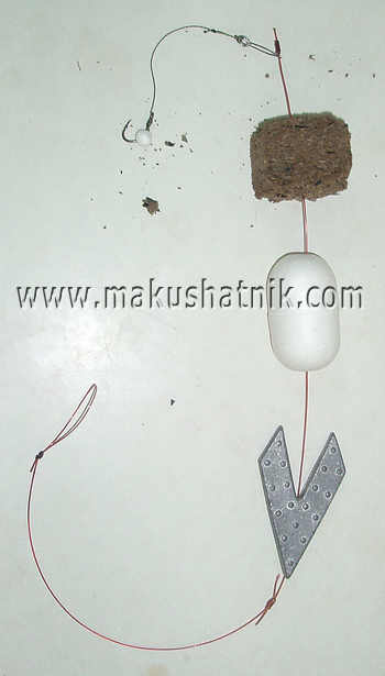 Принцип работы этой приманки очень простой. Цилиндр, из прессованной мелкофракционной смеси, цепляется на специальное коромысло, изготовленное из стальной проволоки.