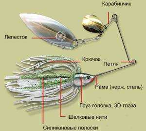 Спиннербейт относится к тем приманкам, которые хорошо работают в теплое время. Классический спиннербейт состоит из одного или двух лепестков — вращающихся блесен и одной джиговой приманки в виде силиконовой рыбки с пышным хвостом, внутри которого спрятан один или несколько крючков. Соединяются эти элементы жесткой проволокой.