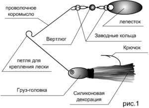 Основу этой приманки составляет Г-образное металлическое коромысло. На одном конце коромысла крепится вращающийся лепесток, а к другому концу крепится джиг-головка. Джиг–головка закрывается силиконовой «юбкой», которая выполняет две основные функции: защищает грузило и крючок от зацепов и дополнительно привлекает хищника. Поклевки бывают очень быстрыми, и рыбак должен быть всегда к ней готов.