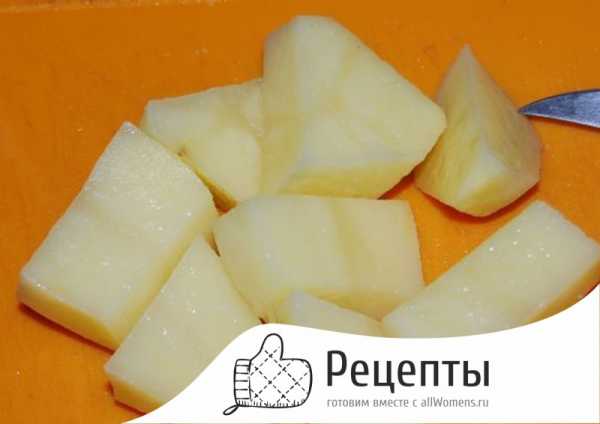 - Картофель нарезаем кубиками, заливаем водой, чтобы не потемнел.