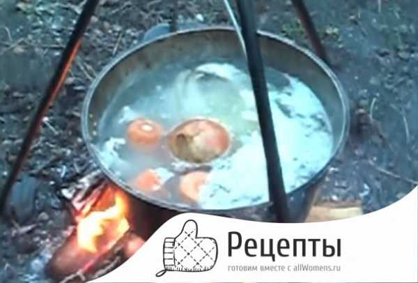 - В кипящую уху добавляем горящее полено, вливаем рюмку водки. Снимаем казан с огня.