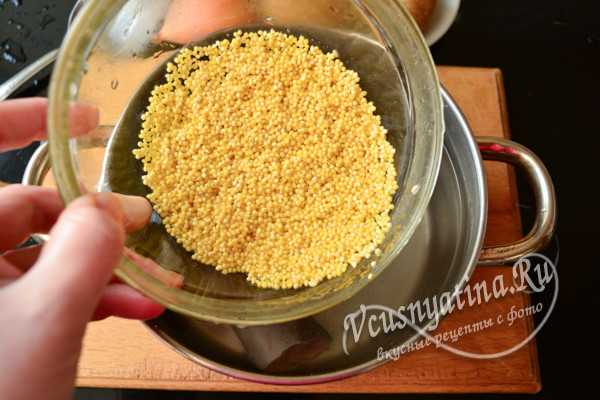 - Промываем 100 г пшена, пока вода не станет прозрачной, заливаем водой и даем немного постоять для набухания.