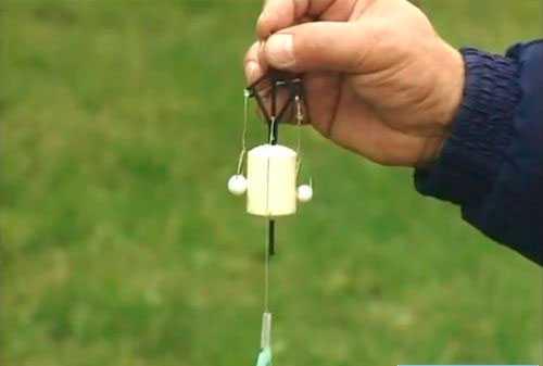 - Привязываем «тремпель» с кормушкой от которого свисают три поводка.