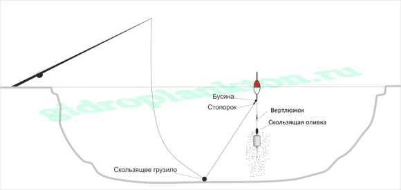 Толстолоб подплывая к этому облачку, засасывает муть и крючки. В этой снасти используется скользящее грузило, которое устанавливается над поплавком. Грузило устанавливается для того, чтобы играть роль якоря. Поплавок встает вертикально благодаря тому, что кормушка тянет вниз.