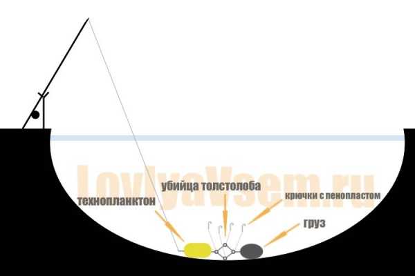 Поводки при ловле на планктон всплывают выше облачка, и это позволяет толстолобу подцепиться на крючок. В технопланктоне содержатся специальные компоненты, которые усиливают аппетит у рыбы.