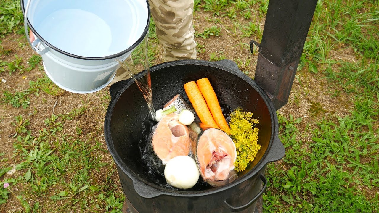 Уберите остатки углей из-под казана, накройте суп и дайте настояться около 10-15 минут. Уха готова, можно подавать!