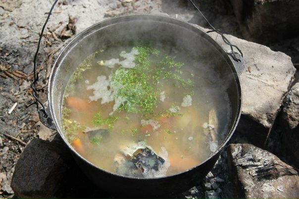 Очень аккуратно перемешайте, снимите образовавшуюся пену и оставьте на костре томиться около 10 минут(до готовности рыбы).