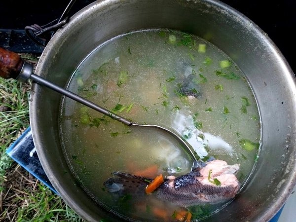 Это самое лучшее и вкусное первое блюдо, которое получается на природе. По этому способу рыбный суп готовится просто и быстро. Приведенную рецептуру можно корректировать, например, любители острого могут добавить другие ингредиенты, такие как перец чили или зубчики чеснока.