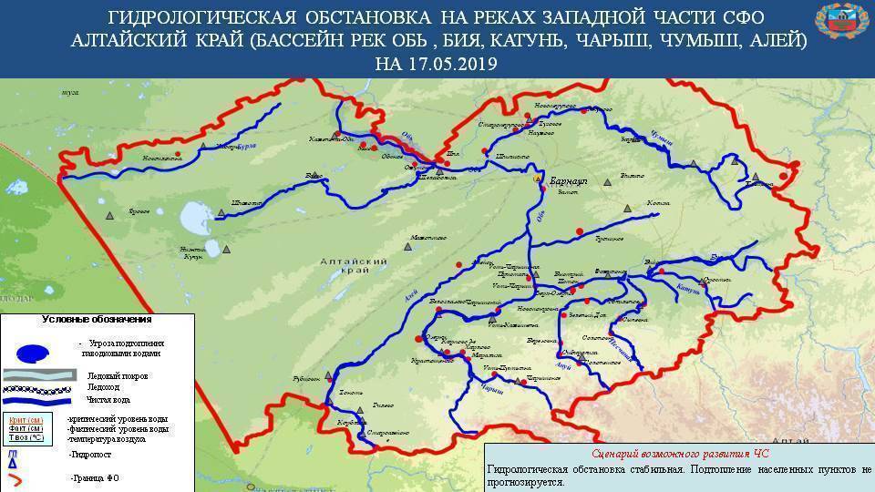 Ранее altapress.ru писал, что наибольший рост уровней отмечен в бассейнах рек Чарыш (в среднем и нижнем течении) и Алей (в верхнем и среднем течении). В 2019 году в крае некоторые реки вскрылись раньше средних многолетних дат, однако специалисты пока не ждут серьезного паводка.