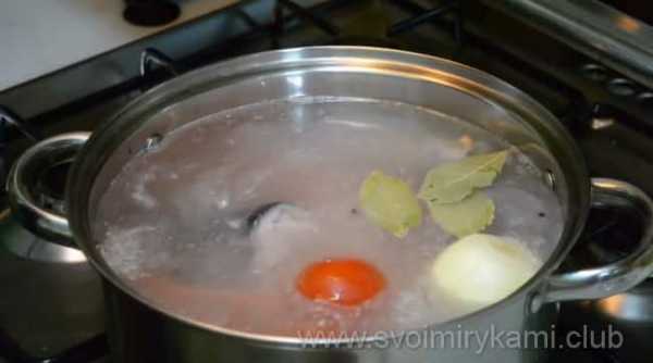 - Подготовленные головы заливают водой, добавляют луковицу и варят 20 минут.
