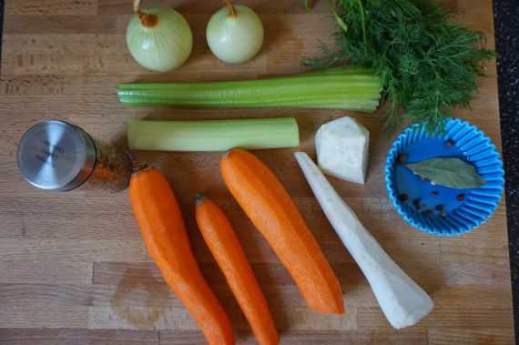 Ингредиенты : 1 л воды, 300 г мелкой рыбы, 120 г репчатого лука, 80 г корней петрушки, 80 г корней сельдерея, 80 г моркови, 100 г зелени укропа и петрушки, соль по вкусу. Для фрикаделек: 300 г филе сига, налима или судака, 200 г пшеничного хлеба, 50 мл сливок, 1 яйцо, 10 г сливочного масла, соль и перец по вкусу.