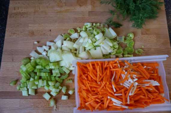 3. Пока вода доходит до кипения, почистите и помойте лук и морковь. Лук нарежьте кубиками или полукольцами, морковь кружочками. Помойте сельдерей.