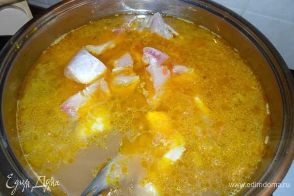 Усильте огонь и опустите в готовый бульон очищенную и разрезанную на крупные куски (шириной 4–5 см) рыбу, варите на умеренном огне 5 минут, не давая сильно кипеть.