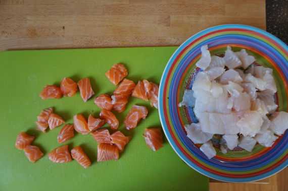 1. Кефаль почистить, промыть и разрезать на небольшие кусочки.