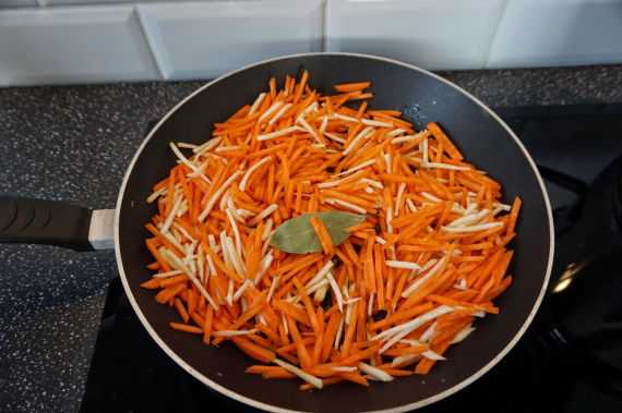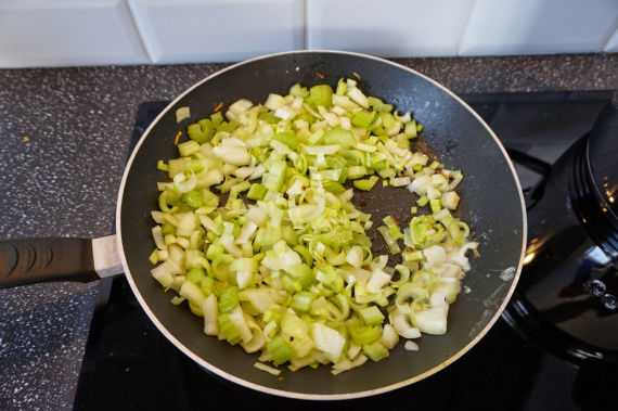 Растопите сливочное масло и обжарьте на нём лук до золотистого цвета. Пока он готовится, нарежьте лук порей и морковь. Добавьте сельдерей, лук порей и морковь к репчатому луку и обжаривайте 5 минут.