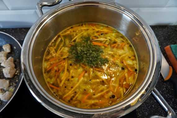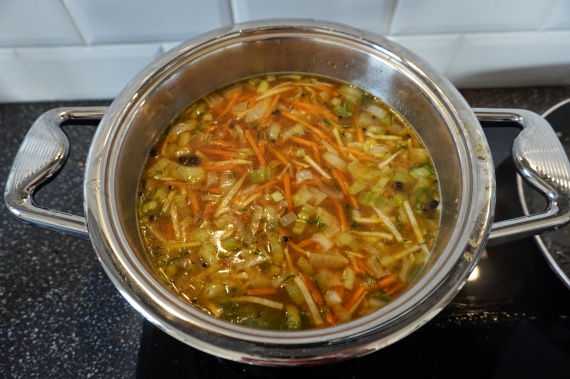 Вылейте процеженный бульон в кастрюлю и варите на умеренном огне 40 минут.