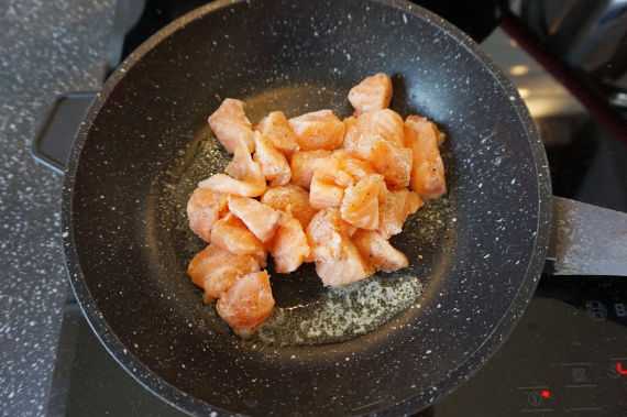 Нарежьте филе окуня на кусочки (примерно по 3 см) и уберите в холодильник.