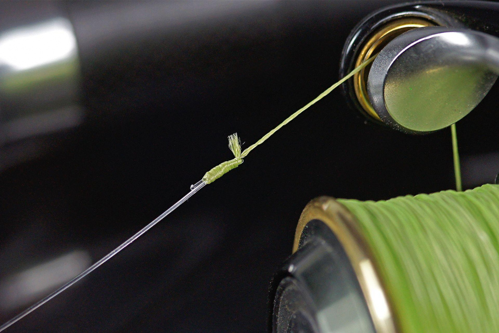 - Основную леску обязательно оборачивать косичкой вокруг шок-лидера, иначе узел деформируется.