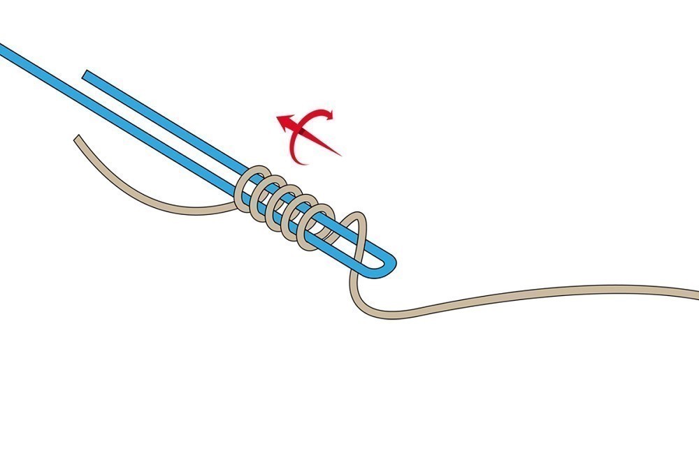 - Сделав последний виток, основную леску переворачивают, и обороты делаются в противоположном направлении. Проделав 10 оборотов, монолеску необходимо протянуть в петлю плетеной лески. Узел последней затягивается.