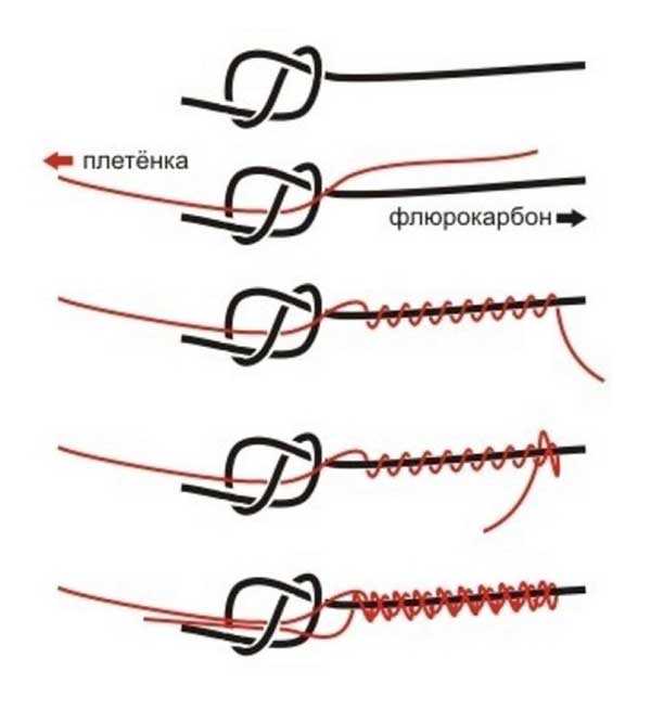 Плетенка или обычная мононить обматывается вокруг более жесткого флюорокарбона, и чем мягче и тоньше леска, тем больше делается витков.