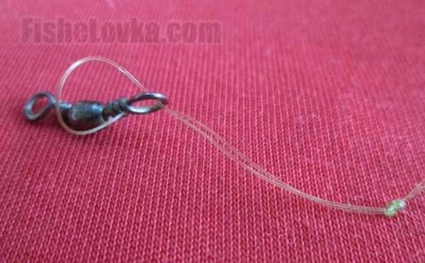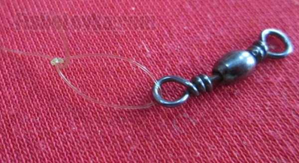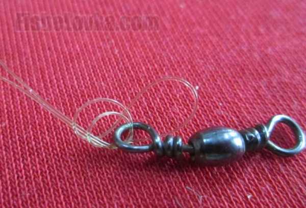 - В полученную петлю от согнутой части лески с одной стороны от узла продеваем вертлюжок и затягиваем.