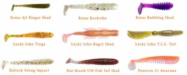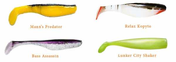 Примеры. Классические виброхвосты, изготавливаемые из обычного силикона выпускаются такими брендами, как Mann’s, Relax, Bass Assassin, Profi Blinker, Lunker City и т.п.