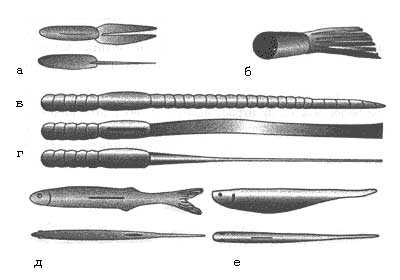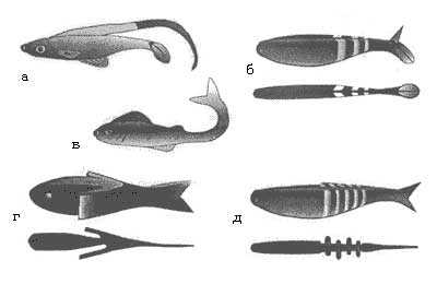 Рис.3. Пассивные пластиковые приманки: а) “личинка”; б) “кальмар”; в) “червь”; г) “червь” с ленточным хвостом; д) “рыбка”; е) “рыбка-слаг”.