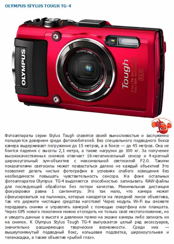 Как видим большинство камер обладают схожими техническими характеристиками и выбирать можно только из того что нужно именно вам. К примеру, не обязательно переплачивать за наличие GPS и NFC и всякие барометры, компасы и т.д., многим это не понадобится при повседневной фотографии. Также особо не рекомендуем ронять водонепроницаемый фотоаппарат. Производители лукавят, когда пишут о падении с 2 метровой высоты. Падение выдерживают, но не на голый бетон, а на лист фанеры — именно это подразумевает военный стандарт, используемый всеми производителями подводных фотоаппаратов. Очень жаль, что нам не удалось увидеть новинки представленные компаниями Samsung или Casio, видимо производители решили не развивать данное направление учитывая популярность экшн-камер. Если вам есть что добавить – пишите свои пожелания в комментариях.
