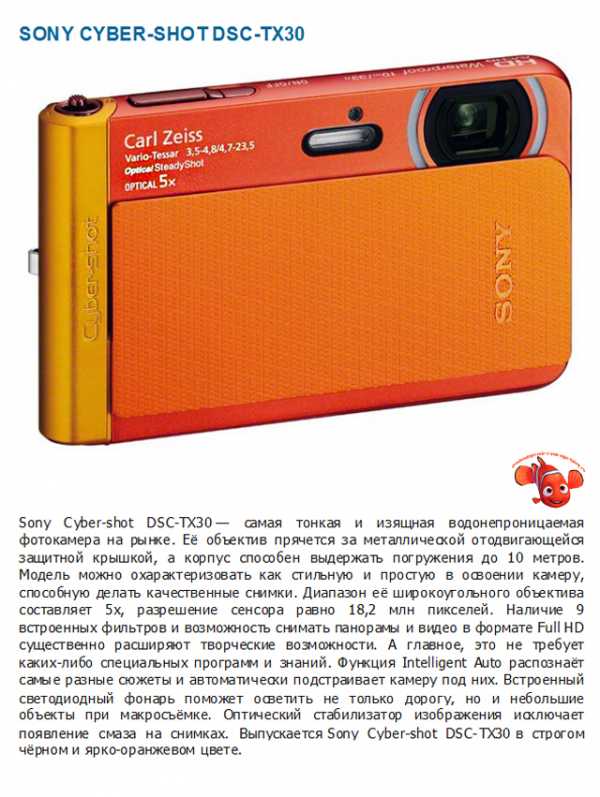 Следующий гаджет, который попал в наш обзор – Sony Cyber-shot DSC-TX30. Нам сразу же приглянулся дизайн, а также наличие легендарной оптики Carl Zeiss. Водонепроницаемый фотоаппарат имеет матрицу с разрешением 18.2 Мп, это один из лучших показателей на сегодня среди подводной техники, это позволяет достичь максимальной детализации на снимках. Также обратим внимание на толщину корпуса, которая составляет всего 15 мм и весом 140 гр. Большое количество цветов корпуса поможет выбрать устройство на свой вкус. Отметим, что из-за такого тонкого корпуса производитель не обременял гаджет GPS, Wi-Fi и другими модулями, кроме самых необходимых.
