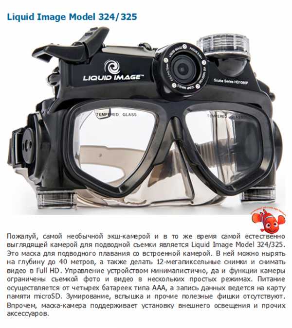 Если задача состоит в съёмке рыбы и непосредственном погружении, на рынке присутствуют специальные камеры. Они имеют защищённый корпус и высокое качество съёмки. Бренд Nikon выпускает специальные экстрим-камеры с качеством снимков в 16 мегапикселей. Дрожание рук ныряльщика компенсируется стабилизацией, а дайвер может делать серийные фото. Современные светодиоды создают полную видимость, чего не позволяет простая маска.