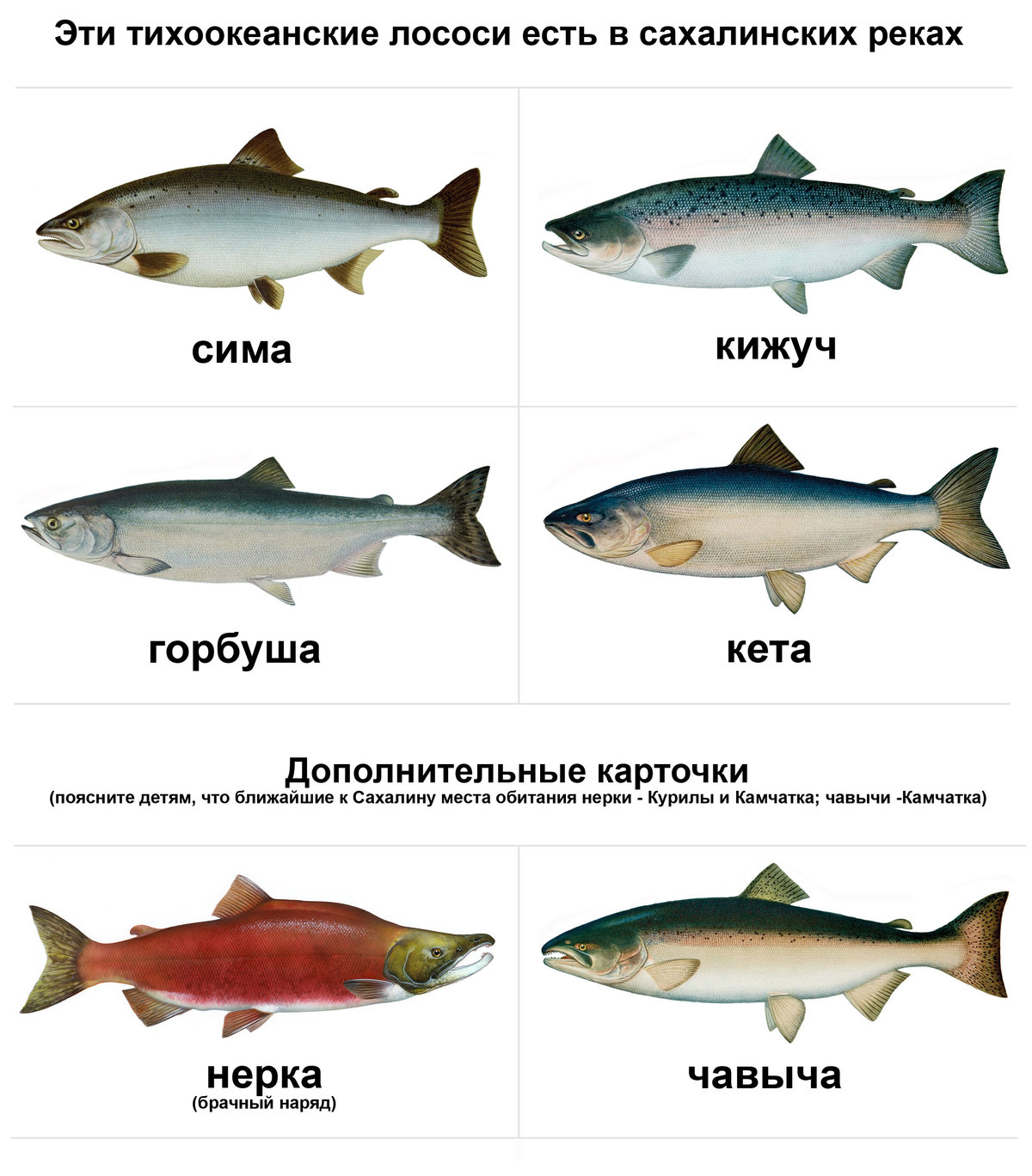 ЧавычаСамый большой тихоокеанский лосось, вырастает до 60 кг при длине до 2 метров. Ареал распространяется от Японии до Камчатки в Евразии, от Калифорнии до Аляски в Северной Америке. В Евразии нерестится всё лето с июня до августа, в Североамериканская популяция ещё осенью и зимой.