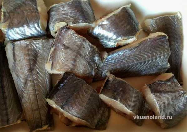 - Рыба нарезается кусочками, которые обваливаются в крахмале.