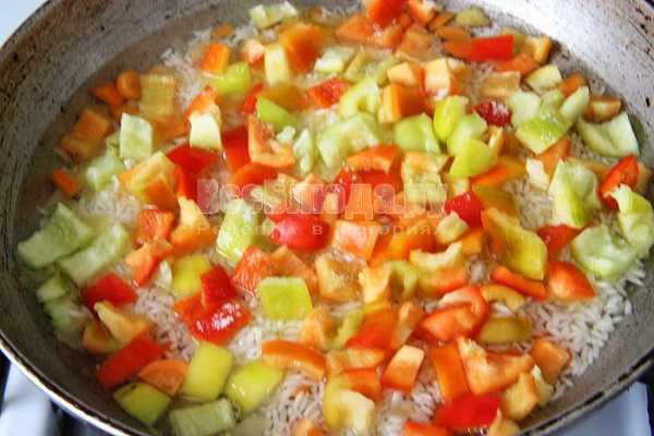 ![]() Следом сразу же высыпаю нарезанные кубиками перцы. Вливаю чуть больше стакана воды, солю, накрываю сковороду крышкой. |