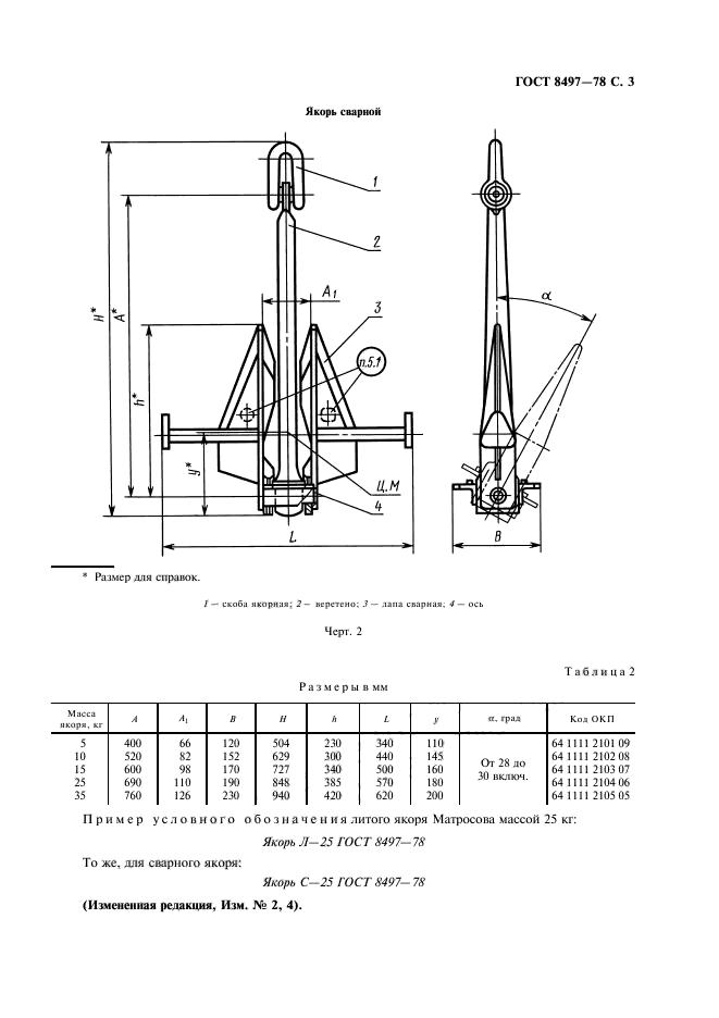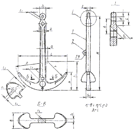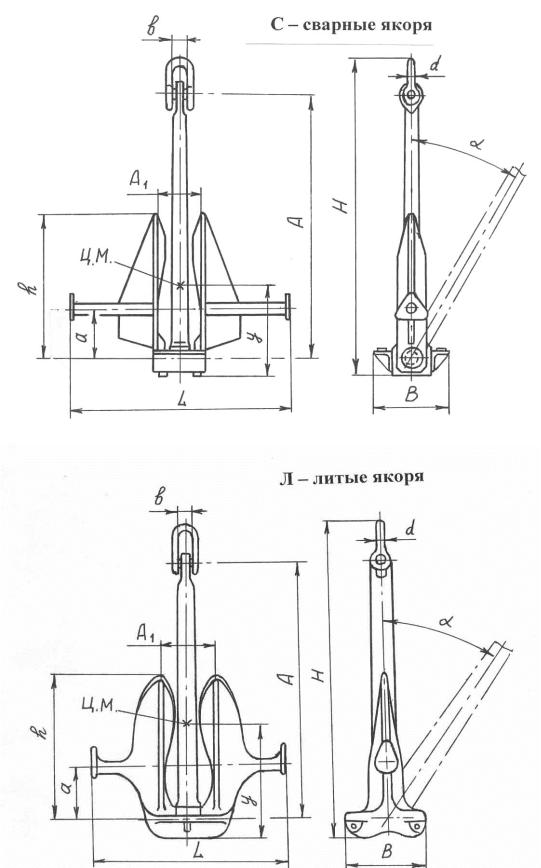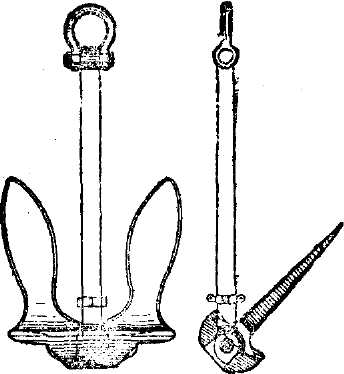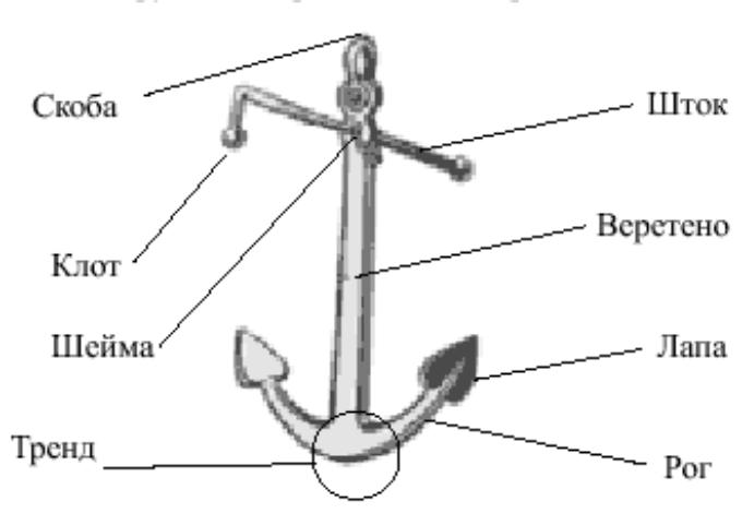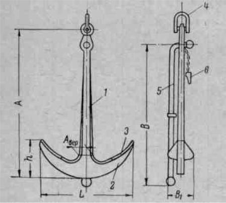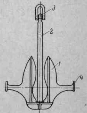 Конструкция якоря такова: веретено, лапы, боковые штоки, якорная скоба.