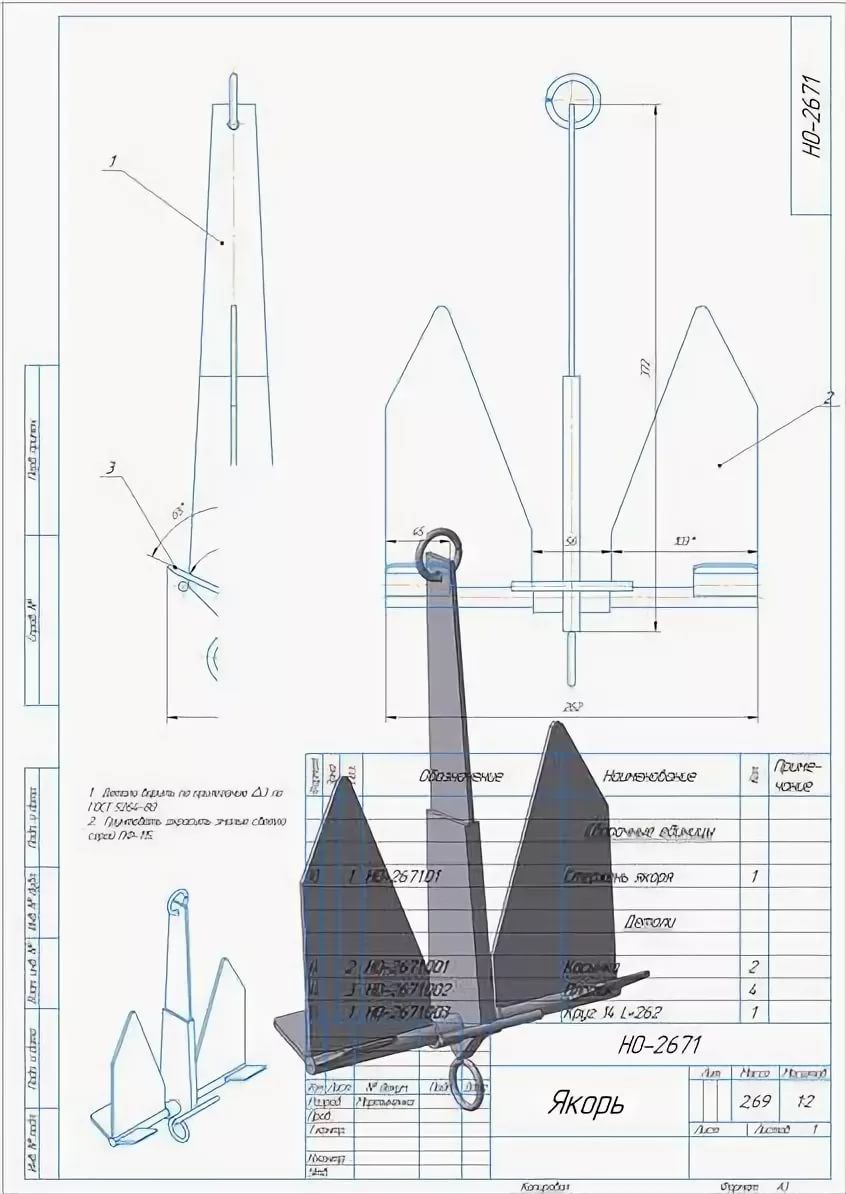 Якорь – это особая конструкция (сварная, литая или кованая), которая опускается на дно и удерживает судно с помощью якорной цепи или каната. Она состоит из нескольких элементов: