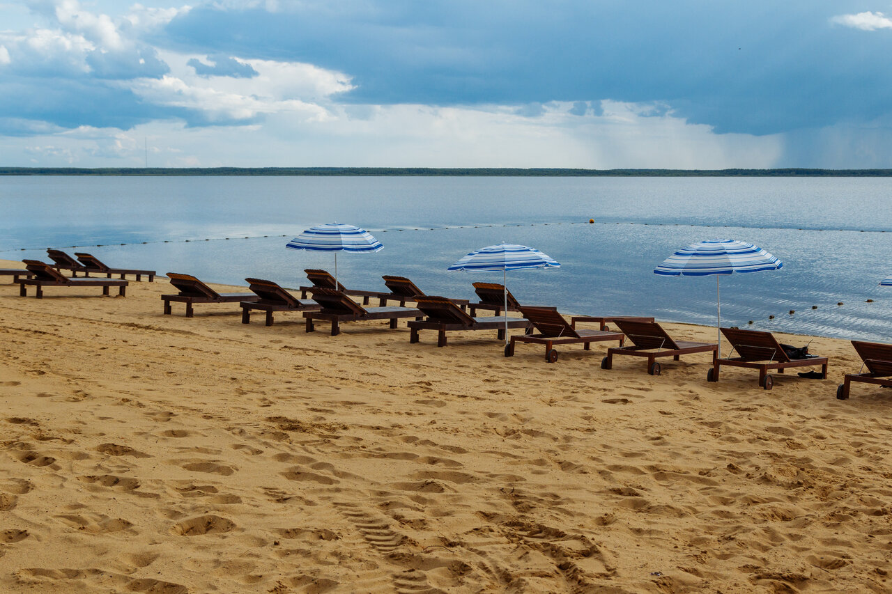 На собственном песчаном пляже отдыхающие купаются в Рыбинском водохранилище и загорают на теплом песке.