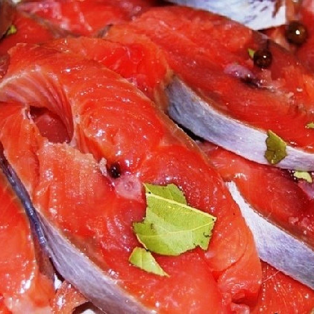 - В большую миску положите кусочки лосося, посыпьте специями для маринования, двумя лавровыми листами, а затем слоем лука и повторяйте эти слои, пока не будут использованы все ингредиенты.