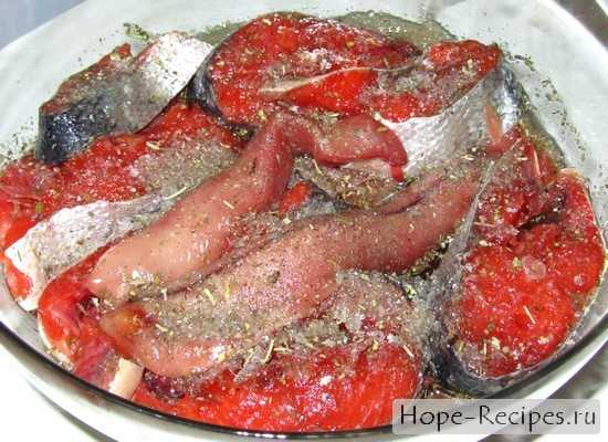 - Кусочки рыбы выкладывают слоями, вместе с луком, специями и лимонным соком.