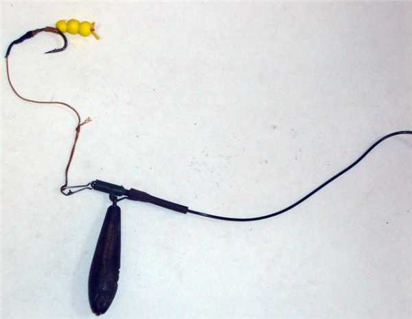 Оснастка вяжется таким образом. Для начала отрезается поводочный материал. Длина поводка может быть разной, в зависимости от условий ловли. На поводке стандартным способом вяжется крючок. Отличие лишь в том, что он вяжется не на конце поводка. Запас материала должен быть таким, чтобы после привязывания крючка его хватило на волос (длина волоса зависит от размера крючка и бойлов; смонтированный бойл должен находиться в нескольких миллиметрах от крайней точки крючка) и петельку для стопора. Осталось лишь надеть на другой край поводка грузило — и снасть готова. Так выглядит простейшая оснастка бойлов.