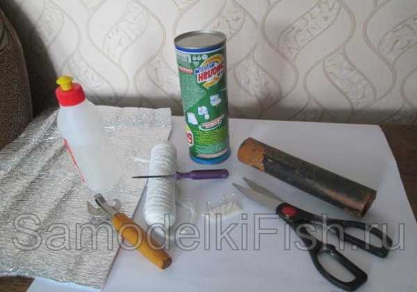 Размечаем и отрезаем ножницами подходящий для обертывания цилиндра кусок изолона. Кроме фольгированного изолона, которым мы воспользовались в этой конструкции, можно применить поролон или иной мягкий рулонный материал, в котором будут легко закрепляться, но не тупиться, наши крючки.