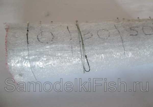 Цепляем поводки за головки булавок и оборачиваем их вокруг цилиндра с небольшим натяжением, после чего фиксируем крючок в мягком материале внешней оболочки цилиндра. Для наглядности мы использовали поводки из тонкой плетеной лески.