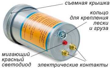 Корпус электронной приманки имеет цилиндрическую форму. Выкрашен он в красный цвет. С боковых сторон цилиндр закрывается крышечками. Их цвет – красный и чёрный. На крышечке красного цвета расположены промаркированные электрические контакты. Один из них является положительной клеммой. Сама же поверхность боковой крышечки представляет собой светоизлучающий элемент.