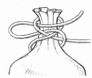 Мешочный узел (рис. 109). Во флотах различных стран матросы хранили свои личные вещи по-разному — в мешках, рундуках и «чемоданах». Например, по традиции военного королевского флота Великобритании одежда матросов хранилась исключительно в парусиновых мешках длиной 3 фута с диаметром круглого днища 1 фут. Матросам торгового флота Великобритании разрешалось иметь в кубрике деревянные рундуки размером примерно 2,5х1,5х 1,5 фута. В Российском императорском военном флоте для хранения личных вещей матросов употреблялись большие и малые «чемоданы», сшитые из серой парусины № 6. Большой имел длину 2 фута 9 дюймов, ширину 1 фут 2 дюйма и высоту 1 фут. Малый был длиной 1 фут 2 дюйма, шириной 1 фут и высотой 9 дюймов. Оба имели от четырех до семи люверсов и парусиновый клапан. Брезентовые мешки английских военных матросов имели 12 люверсов, которые затягивались куском линя. Для переноски мешков матросы прикрепляли к ним кусок штерта, которым завязывали их мешочным узлом.