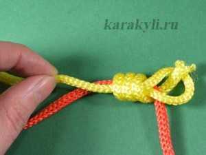Кончиком из желтого шнура начинаем обвивать вокруг петли и красного шнура, поднимаясь вверх к петле.