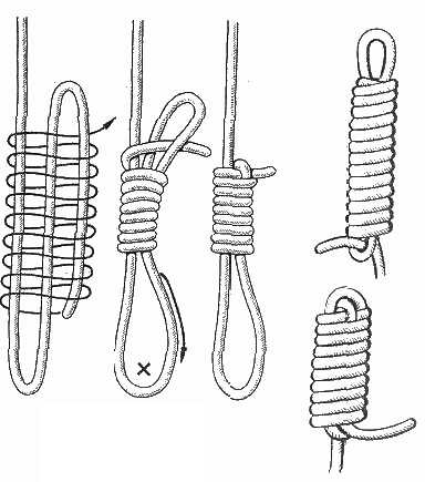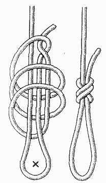 Чтобы завязать этот узел, трос укладывают в виде двух одинаковых по размеру петель. Обе петли обносят несколько раз ходовым концом троса, после чего этот конец пропускают в петлю, обращенную к коренной части троса, и, вытягивая крайнюю петлю, зажимают в ней. Затягивающуюся удавку всегда можно без труда развязать, если потянуть за коренную часть троса.