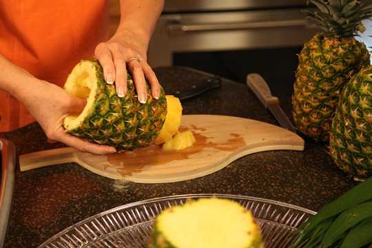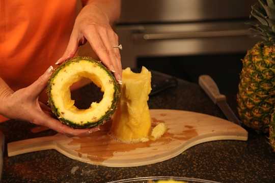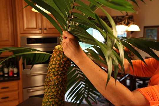 Вначале отрежьте верхушки у ананасов. Постарайтесь отрезать ровно, чтобы пальма не заваливалась. Из всех ананасов удалите сердцевину, кроме первого. Так как первый ананас будет основой для пальмы – он должен быть устойчивым.