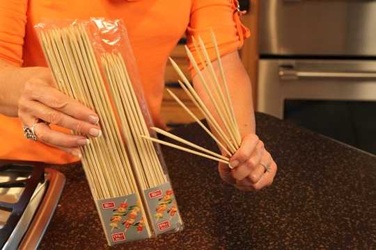 Когда все элементы будут готовы, возьмите шпажки. На нижнюю часть понадобиться шпажек 5, на верхнюю можно и 4. Протыкаете шпажками нижний ананас и устанавливаете сверху новый.