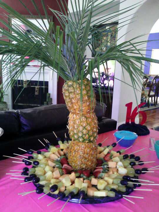У моря должны быть пальмы, а для пальмы вам понадобятся 3-4 ананаса, пальмовые (или похожие листья, которые можно заказать в цветочных магазинах или у флористов) и шпажки для мини-шашлыка.